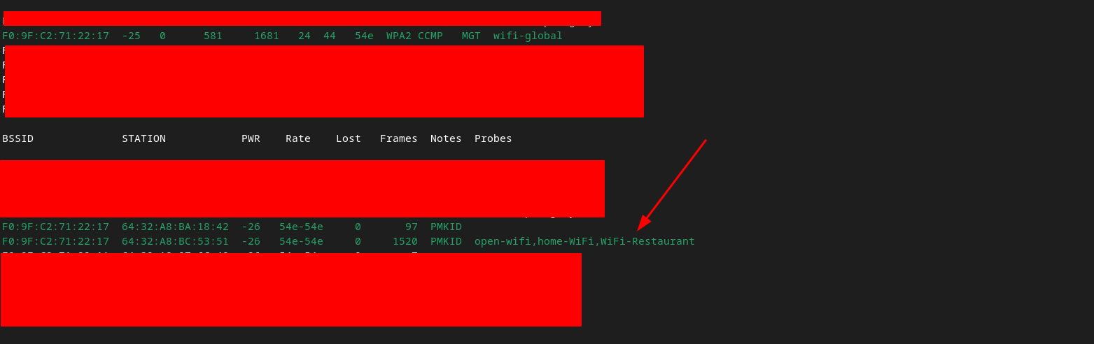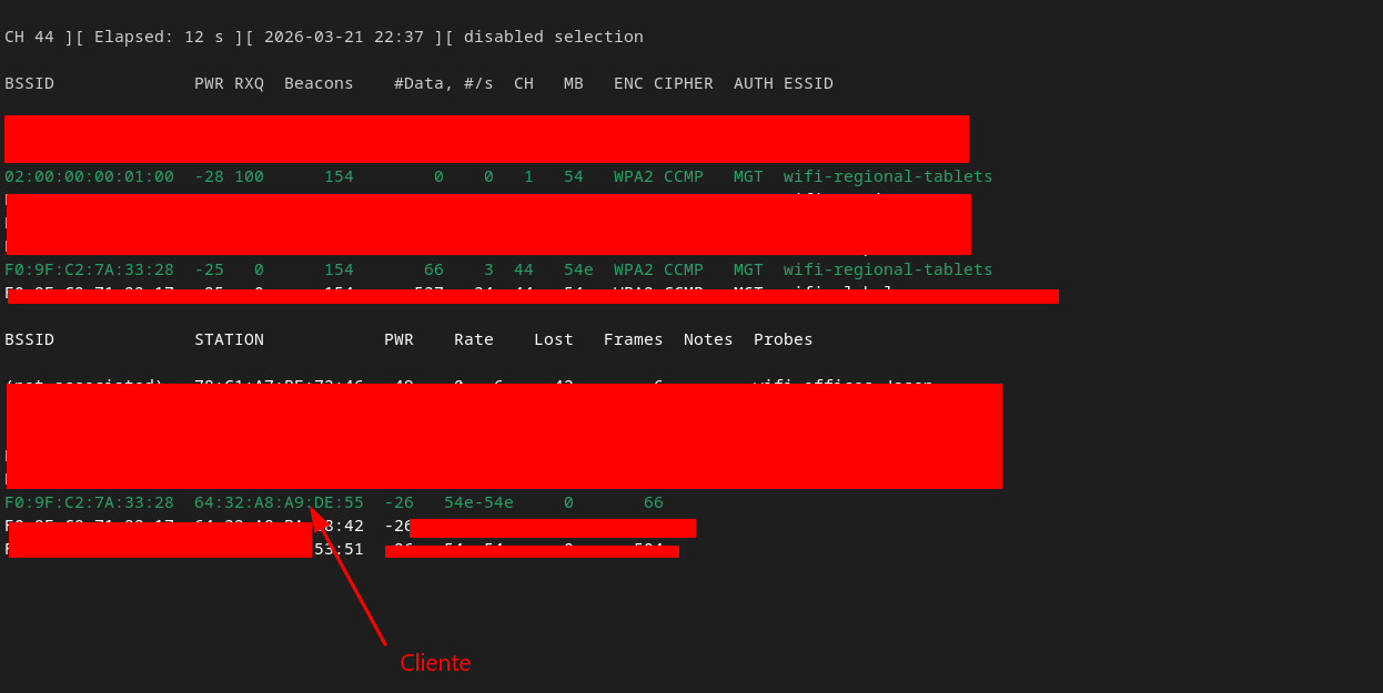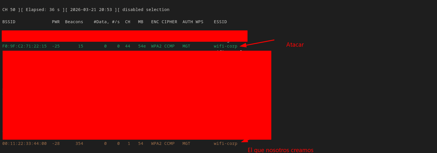 airodump-ng, se detecta laMACde los clientes para realizar un ataque de desautenticación. Al haber 2APsemitiendo la misma red, se debe realizar el ataque contra ambosAPs.