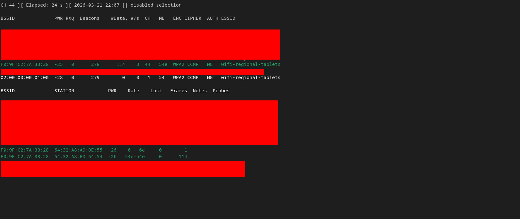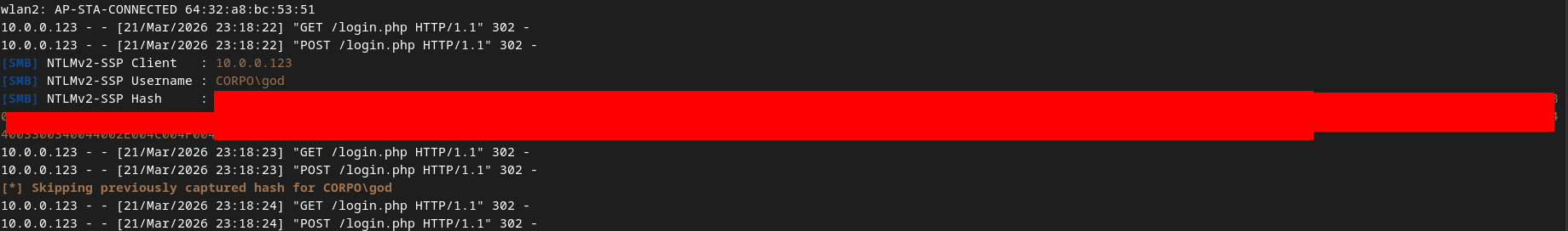 [*] WPA handshakes will be saved to /root/tools/eaphammer/loot/wpa_handshake_capture-2026-03-21-20-51-03-KaW2INdntR5tJPR8a79GIRuBVM64ampb.hccapx