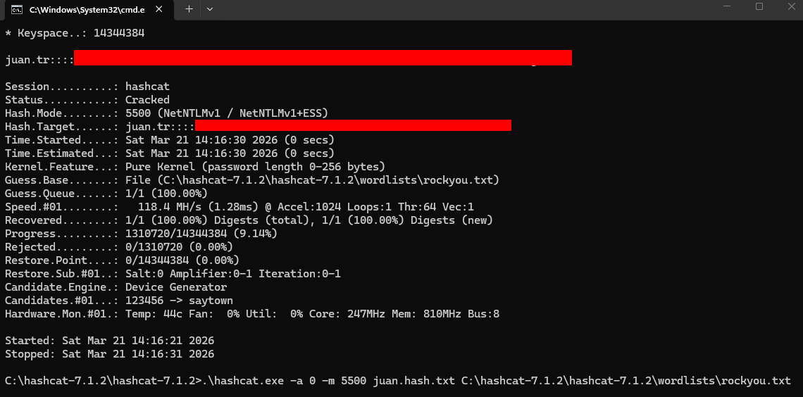 C:\hashcat-7.1.2\hashcat-7.1.2>.\hashcat.exe -a 0 -m 5500 juan.hash.txt C:\hashcat-7.1.2\hashcat-7.1.2\wordlists\rockyou.txt